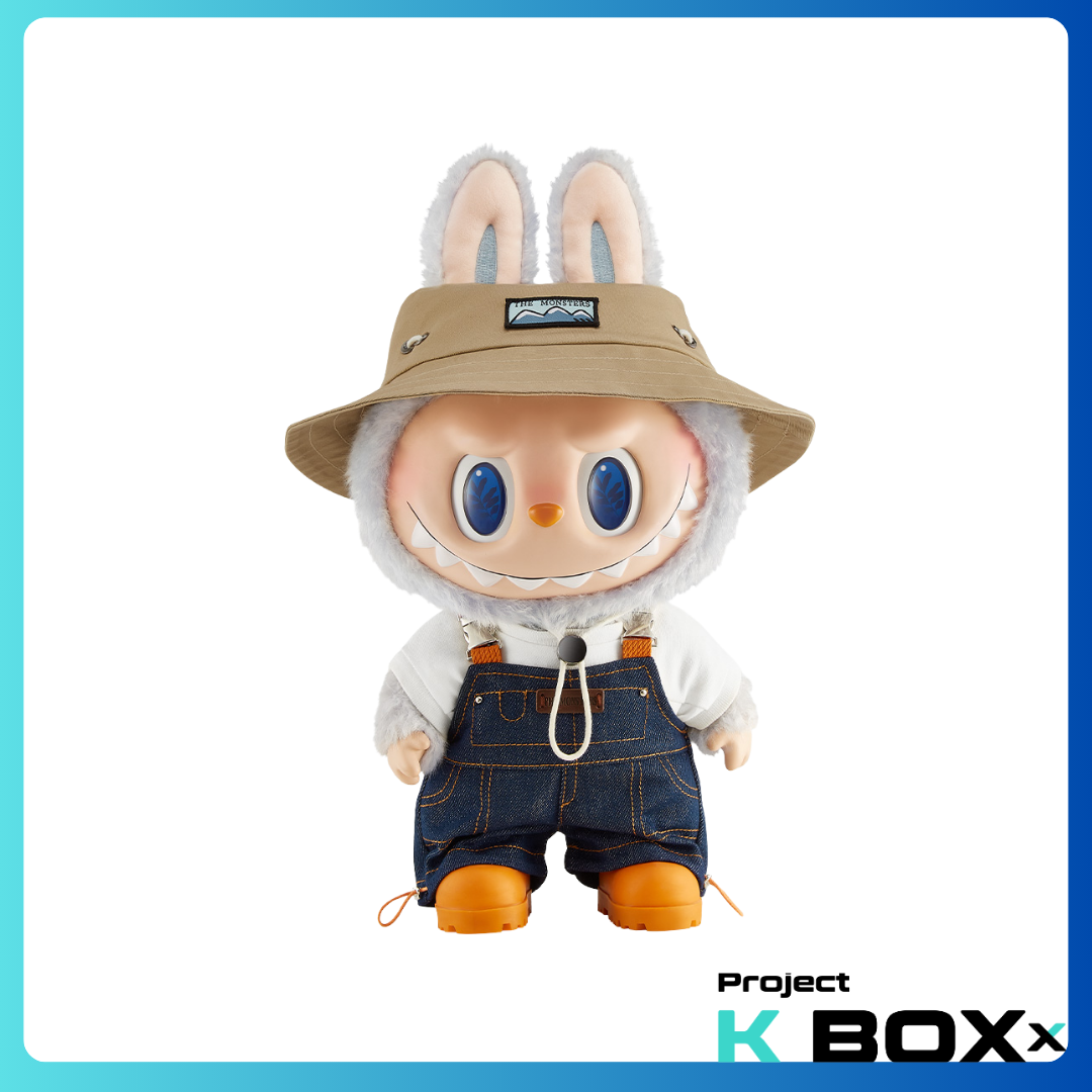 🏕 Phong cách: Labubu mặc yếm denim, đội mũ rộng vành, mang phong cách “đi dã ngoại hoang dã” — độc đáo và đáng yêu